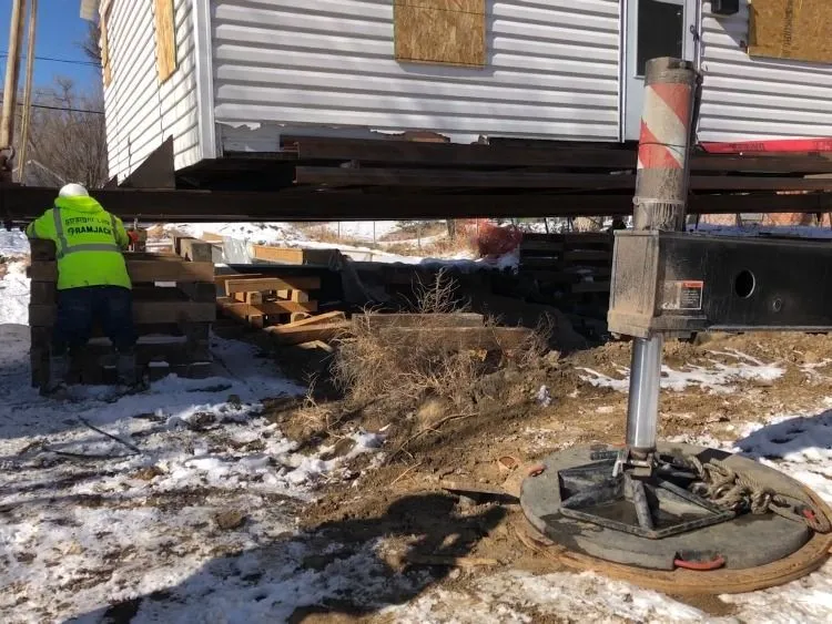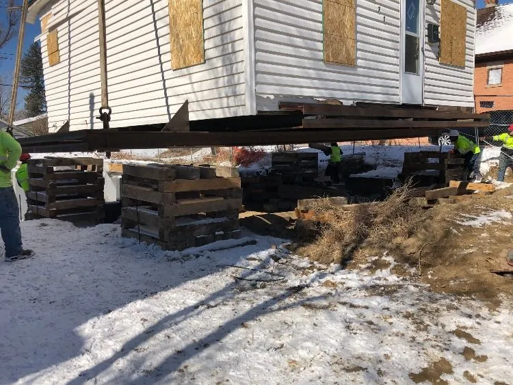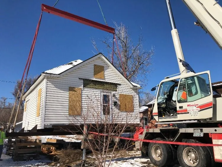 1/27/2021 – Ram Jack of Colorado worked with Winslow Crane to pick the house and move it. The house was temporarily set on “dunnage” approximately 2’ above it’s final resting place to allow for excavation, pier install, form and pour of the crawl space foundation.